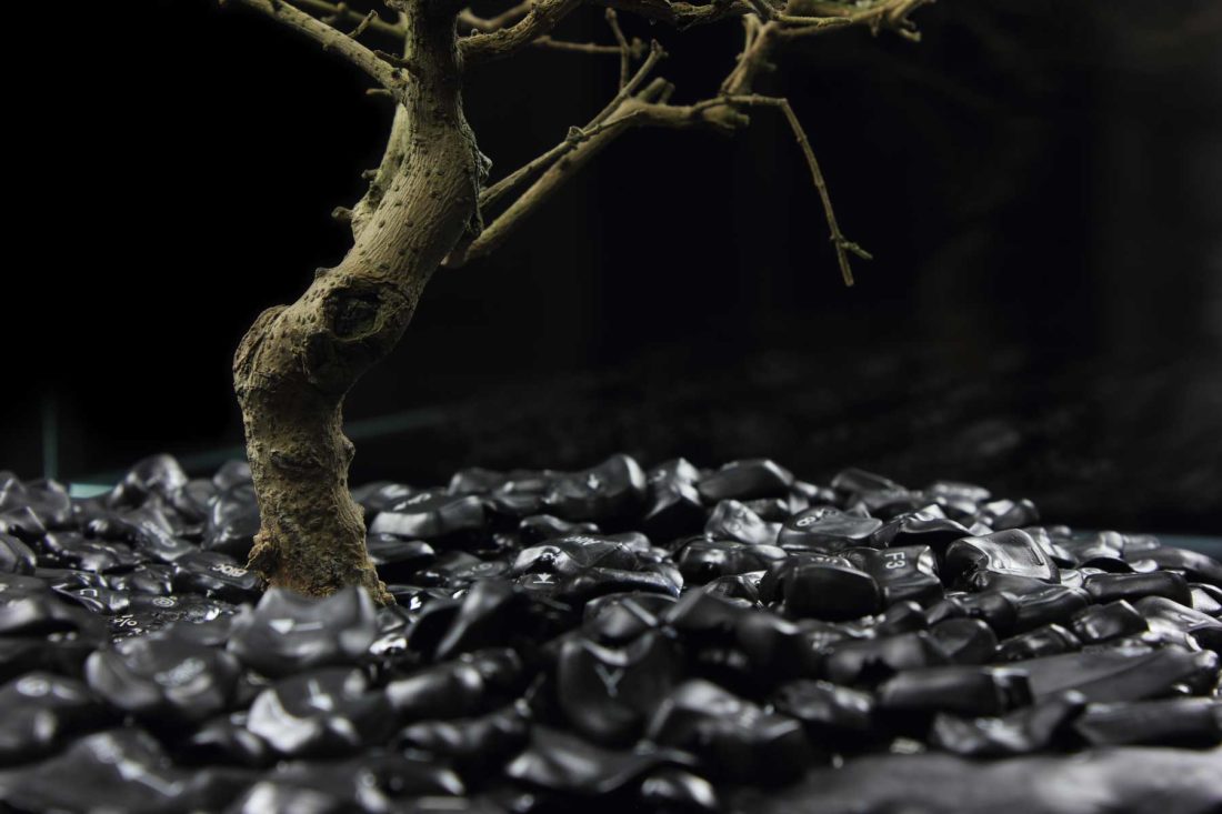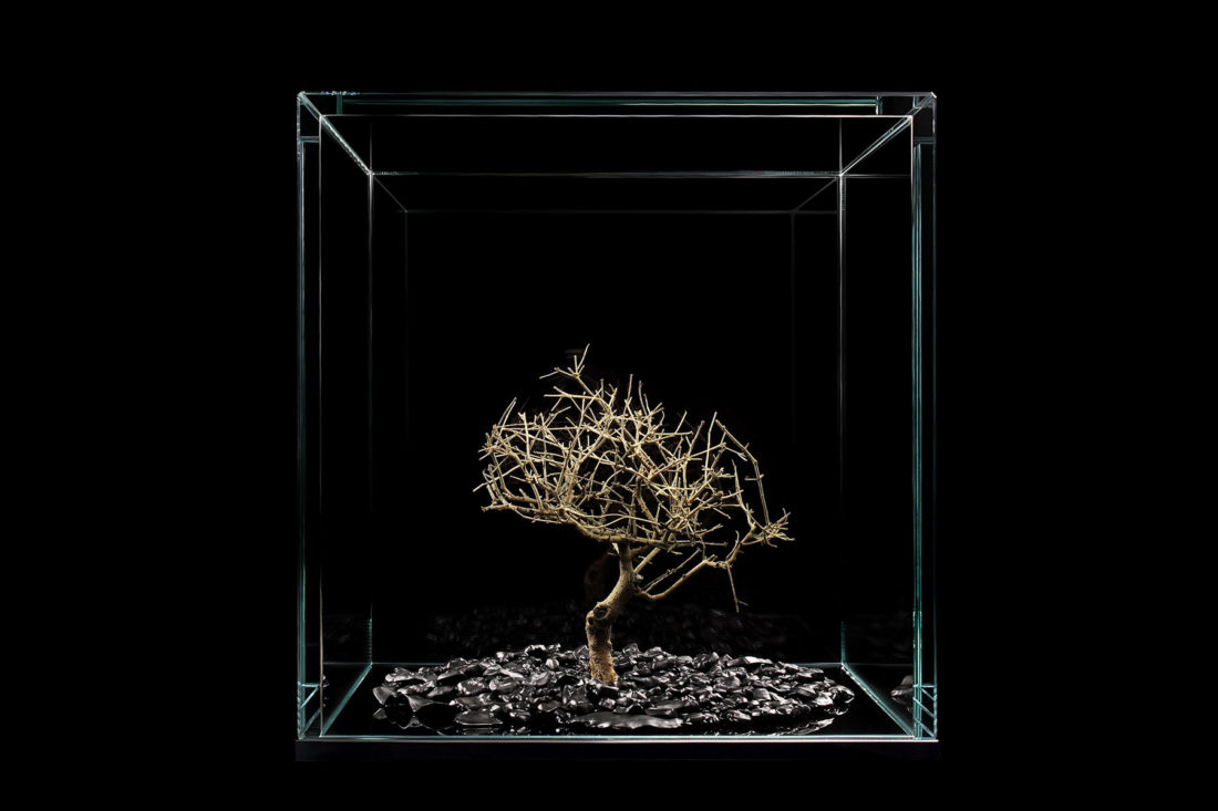Bonsai and keyboard buttonsĀ sealed in extra-clear glass display case mounted on transparent black glass plinth.