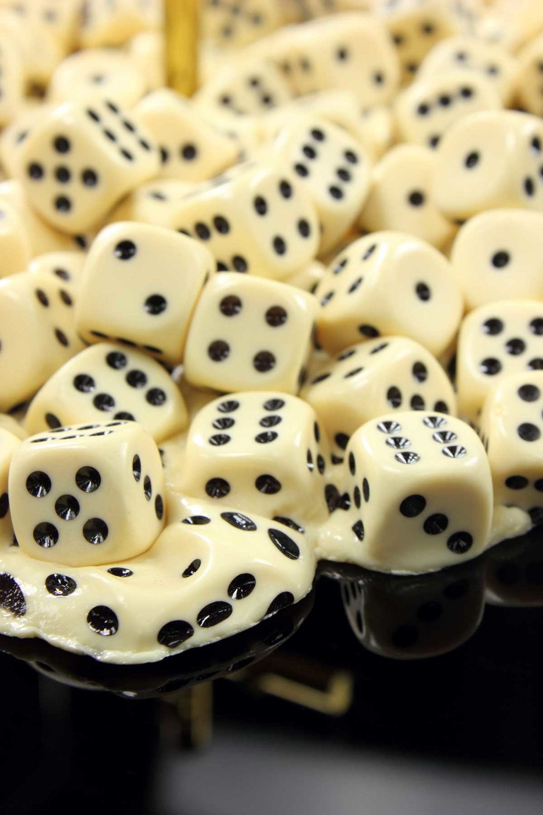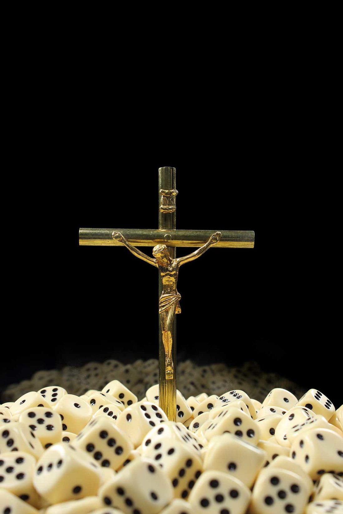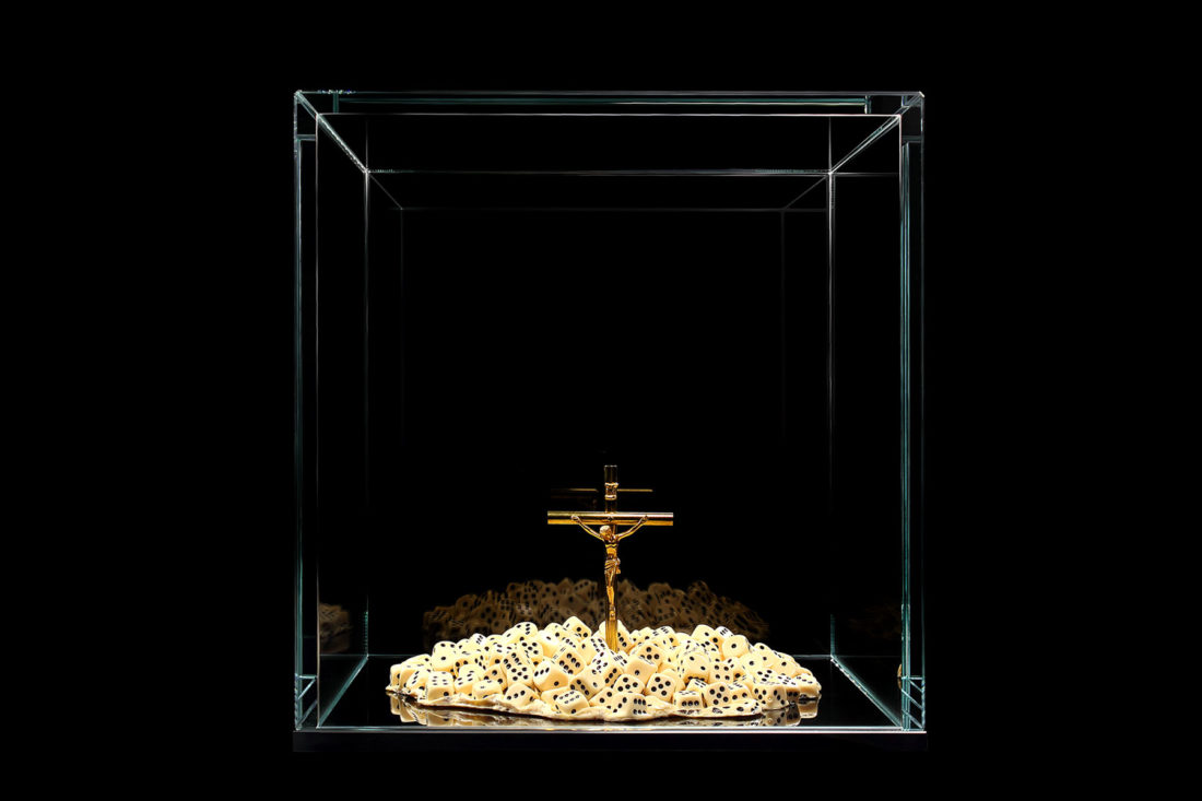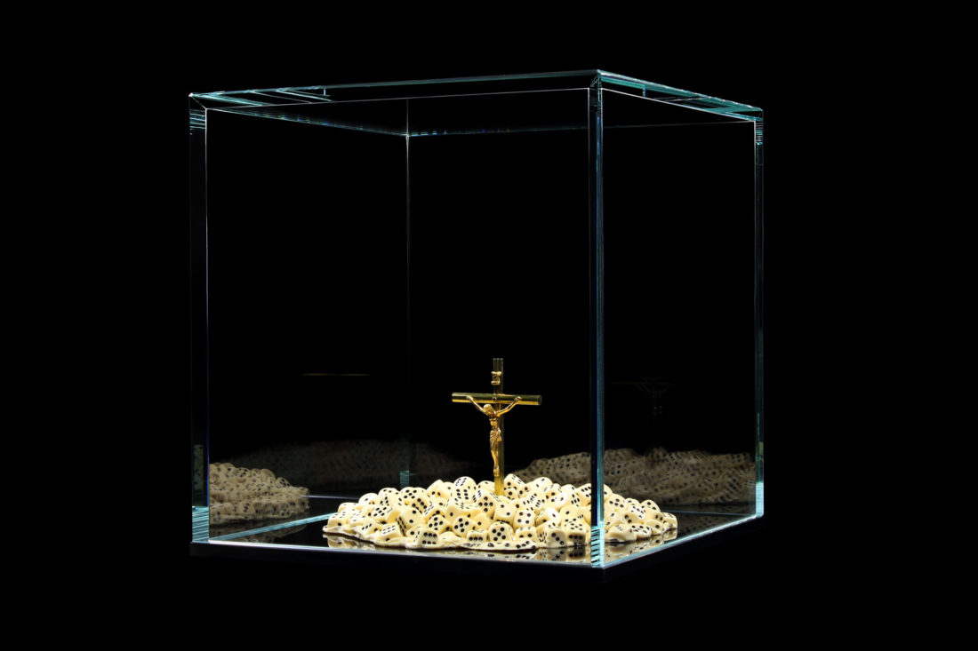 Crucifix and dice sealed in extra-clear glass display case mounted on transparent black glass plinth.